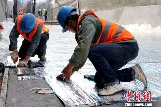 图为工人铺设防水卷材