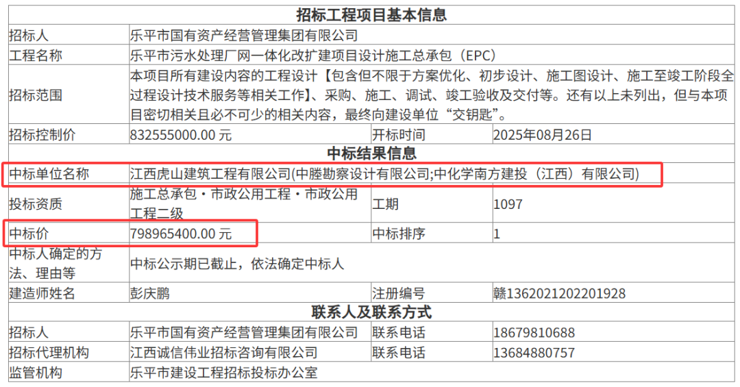 9月2日,江西省乐平市污水处理厂网一体化改扩建项目设计施工总承包(EPC)中标公告发布。