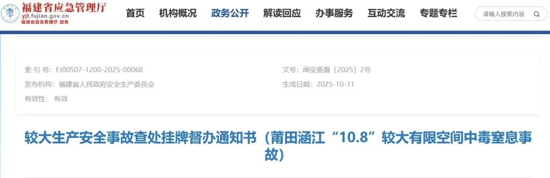 近日,就莆田涵江“10•8”较大有限空间中毒窒息事故,福建省人民政府安全生产委员会发布较大生产安全事故查处挂牌督办通知书。