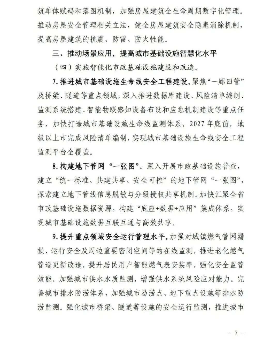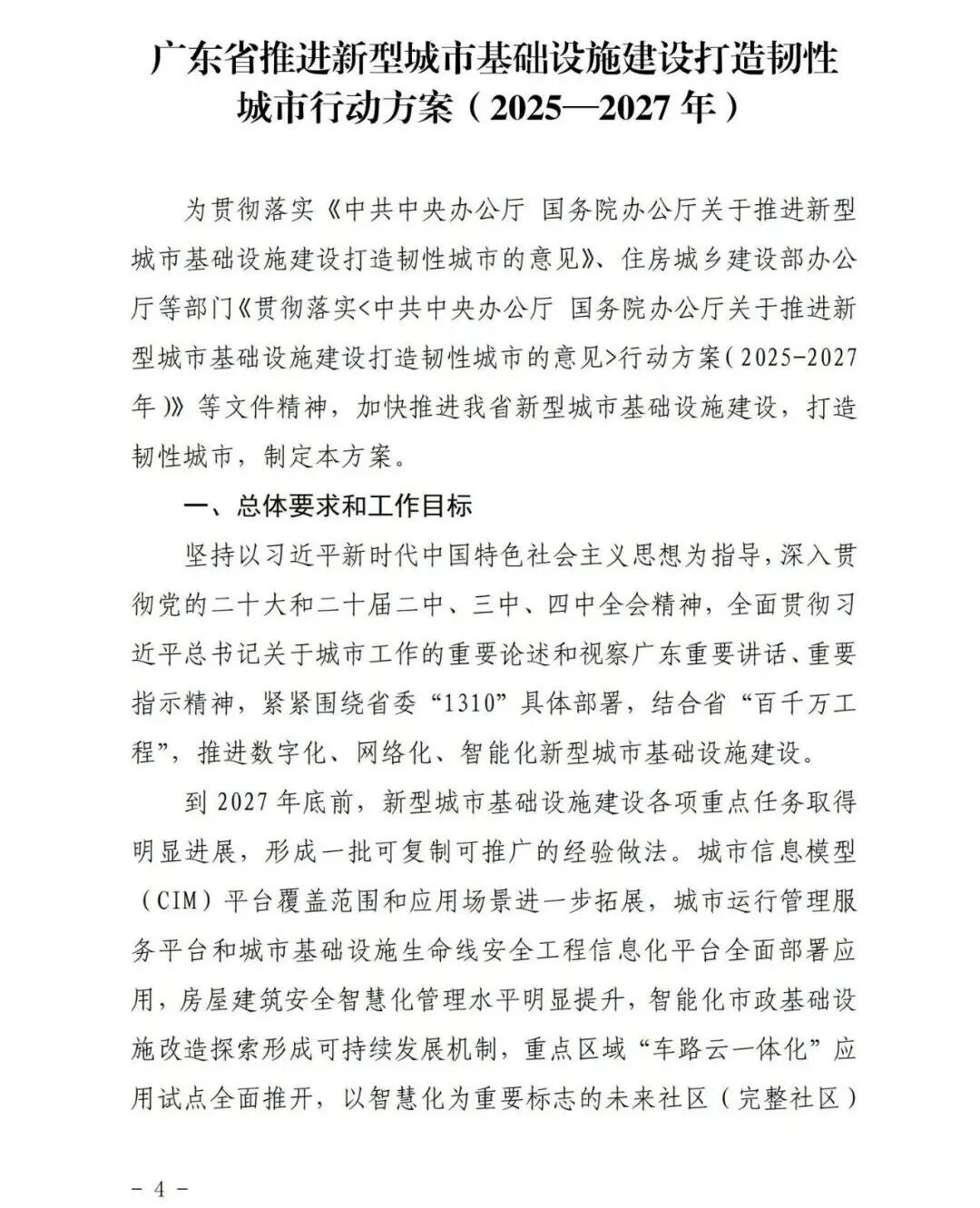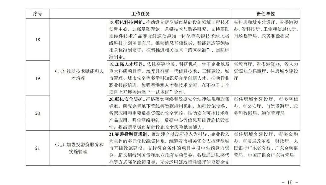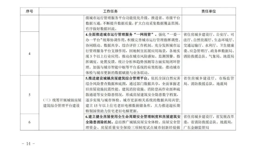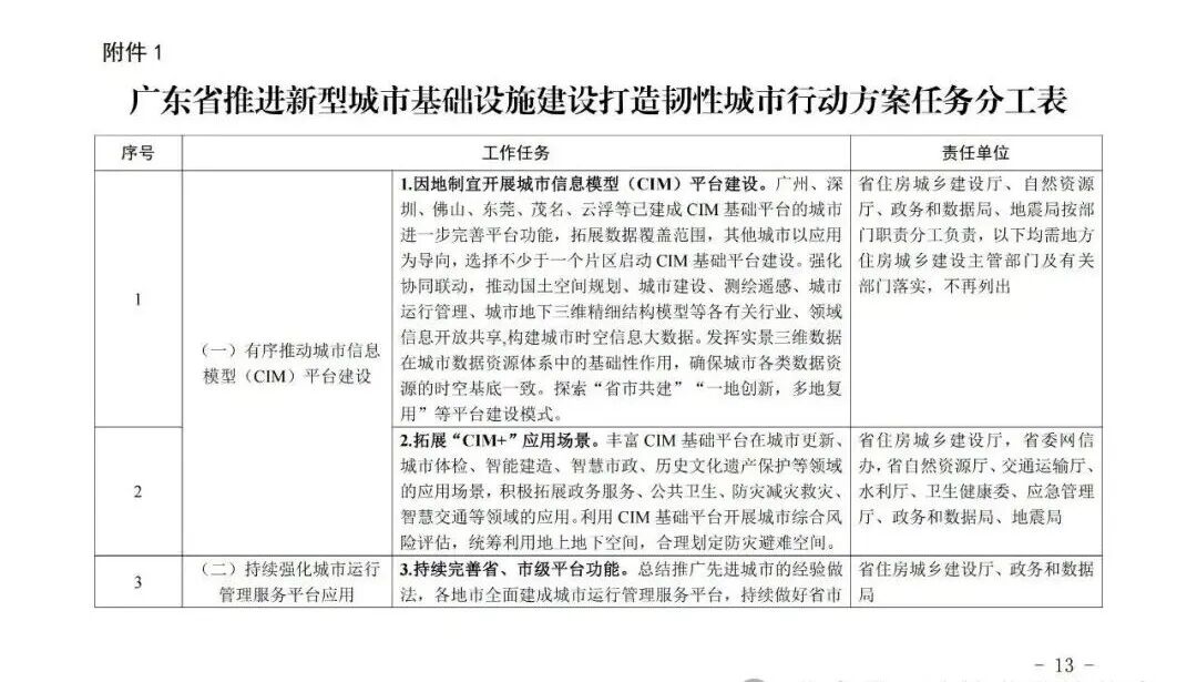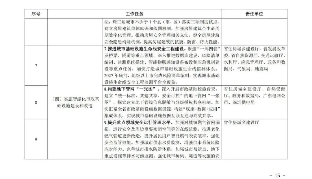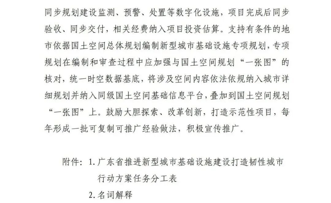 广东省住房和城乡建设厅等部门关于印发《广东省推进新型城市基础设施建设打造韧性城市行动方案(2025—2027年)》的通知各地级以上市住房城乡建设、城市管理和综合执法、发展改革、工业和信息化、公安、财政、自然资源、商务、政务服务数据管理、地方金融、消防救援主管部门,各有关单位: 为深入贯彻《中共中央办公厅 国务院办公厅关于推进新型城市基础设施建设打造韧性城市的意见》精神和《住房城乡建设部办公厅等部门关于印发<贯彻落实《中共中央办公厅 国务院办公厅关于推进新型城市基础设施建设打造韧性城市的意见》行动方案(2025-2027年)>的通知》(建办城函〔2025〕233号)相关要求,广东省住房和城乡建设厅会同有关部门制定了《广东省推进新型城市基础设施建设打造韧性城市行动方案(2025—2027年)》,现印发给你们,请结合实际抓好贯彻落实。