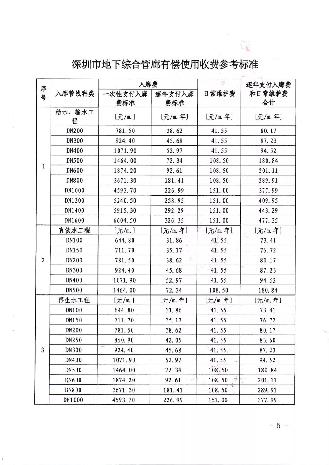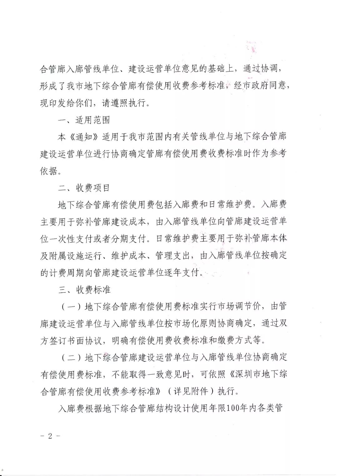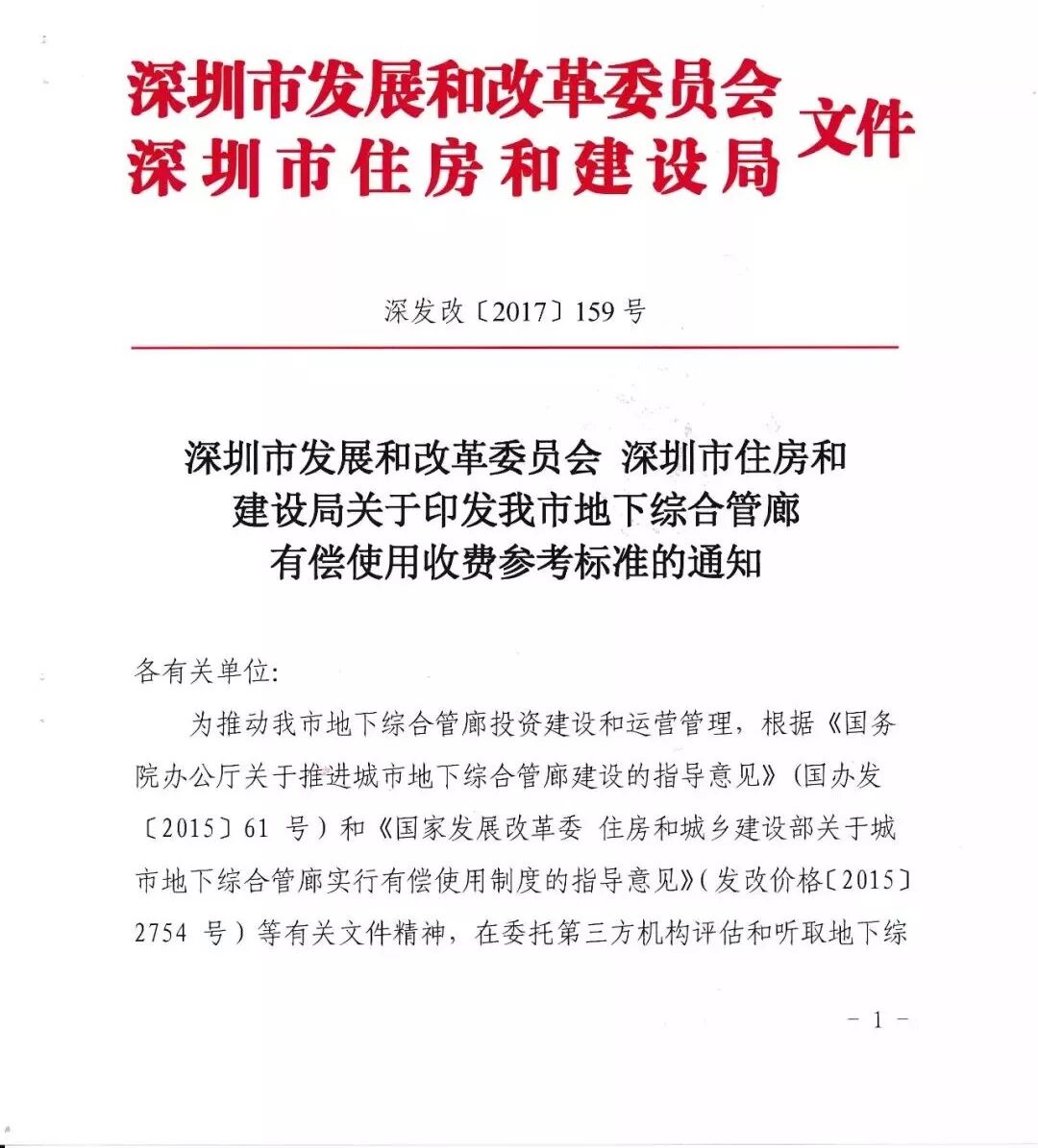 深圳市地下综合管廊有偿使用收费参考标准事项已经深圳市政府同意,现联合深圳市发展和改革委员会印发,请遵照执行。