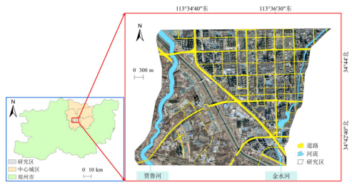 金水河是郑州市中心城区的主要河流,为贾鲁河主要三级支流。金水河由西南向东北流经二七区、中原区、金水区及郑东新区,河道全长27.66 km,流域面积80.1 km2,是中心城区主要的行洪排涝通道之一,也是郑州市唯一串联四主城区的城市内河,其防洪保护对象尤为重要。研究区包含金水河和贾鲁河两条河流,贾鲁河河岸两侧多为裸土或耕地,而金水河河岸两侧多为建筑物,人口和房屋密度较大,容易遭受暴雨内涝灾害,如图1所示。