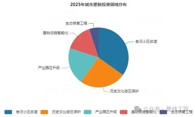 据业内测算,“十五五”期间城市更新市场总容量将达到20万亿元,涵盖以下多个领域:老旧小区改造需投资8万亿元以上,仅电梯加装一项就蕴含超5000亿元市场;城中村及危旧房改造总投资约2.5万亿元;地下管网升级投资约4万亿元,智慧管网改造占比将提升至30%; 历史文脉保护投资约2万亿元。