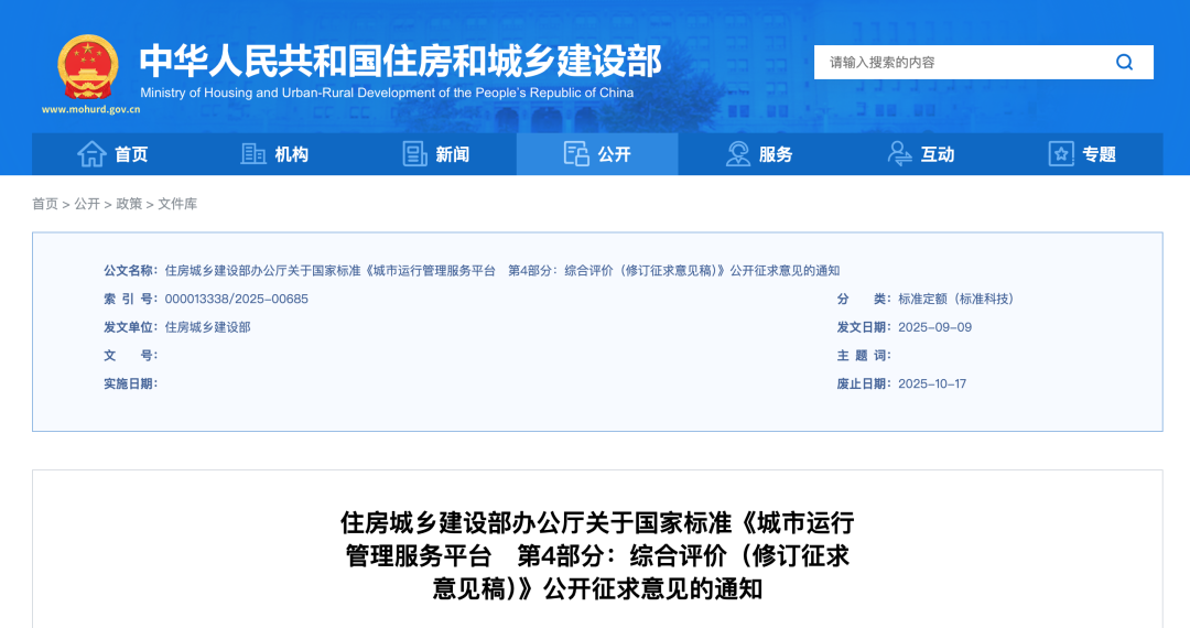 住房城乡建设部办公厅关于国家标准《城市运行管理服务平台 第4部分:综合评价(修订征求意见稿)》公开征求意见的通知