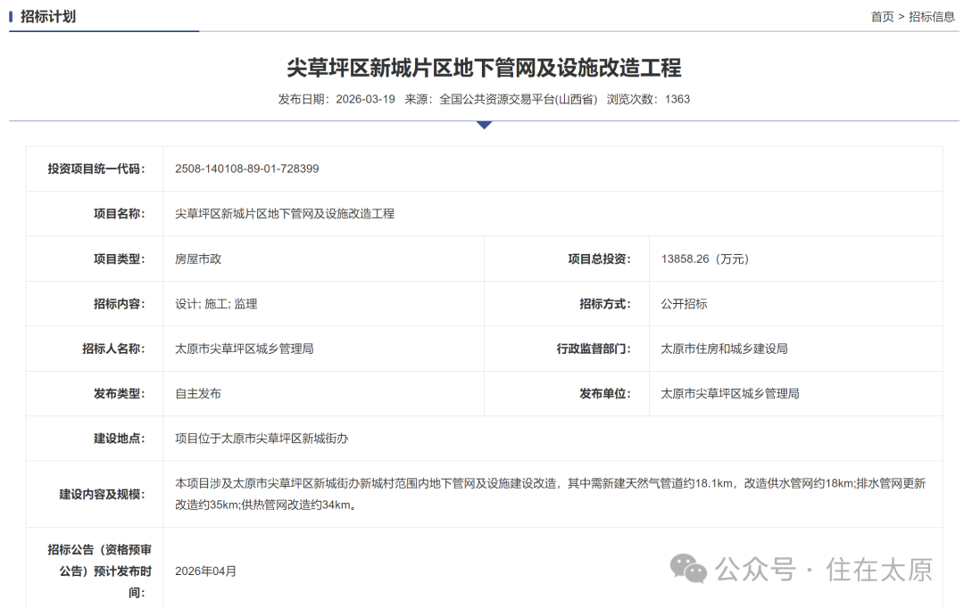 直到近日(3月19日),官方再次发布了尖草坪区新城片区地下管网及设施改造工程的招标计划。
