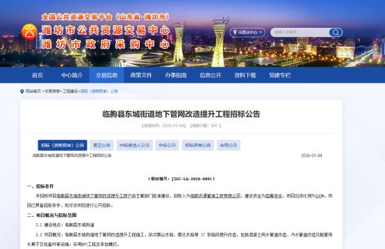 近日,山东商报・山海新闻记者从潍坊市公共资源交易中心获悉,临朐县东城街道地下管网改造提升工程已正式发布中标结果。本项目由临朐沂通管道工程有限公司负责招标,施工总承包由潍坊欧通建筑工程有限公司(联合体牵头人)与山东东沂勘察设计有限公司(联合体成员)联合中标,监理单位则为山东鸣飞工程项目管理有限公司。